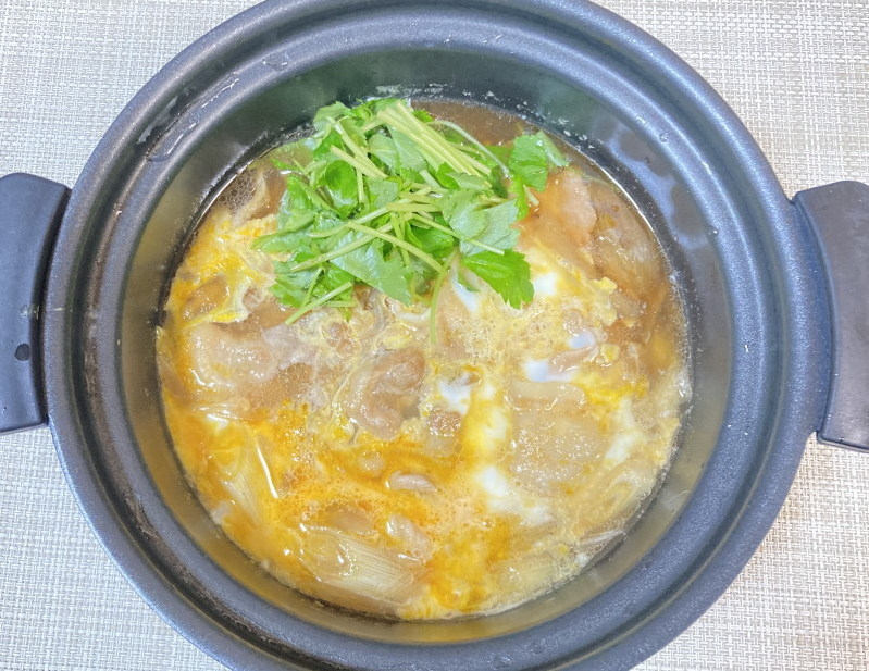 4. 仕上げに三つ葉をのせて完成。好みで粉山椒を振りいれる。