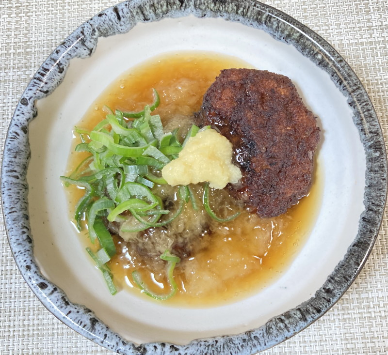 - レンコン餅を器に盛り、みぞれ餡をかけたら上から青ねぎとおろし生姜を乗せて完成。