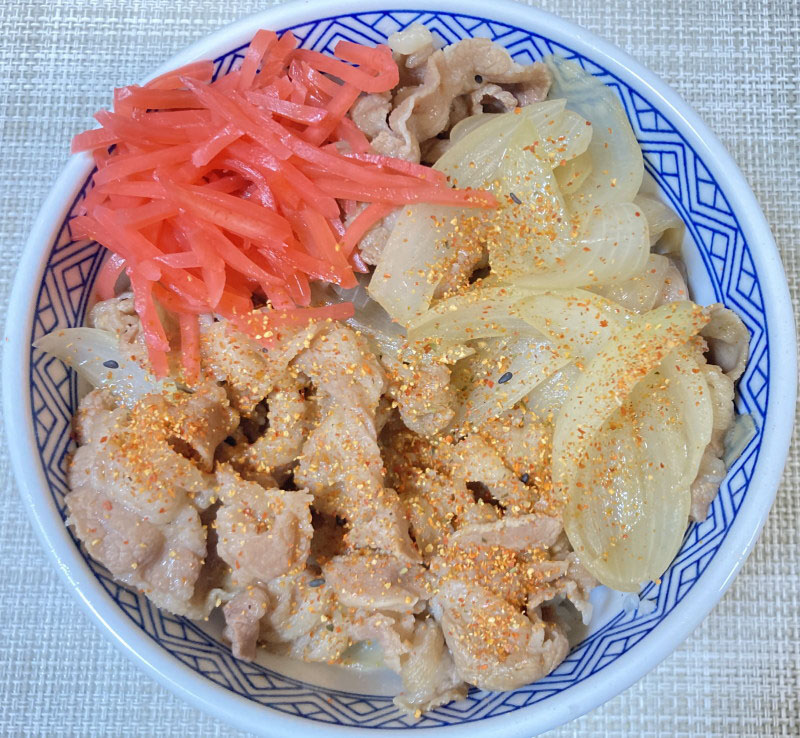 七味唐辛子は、吉野家の七味を使うのがベストですね。また写真の丼ぶりは吉野家でゲットしたものです。