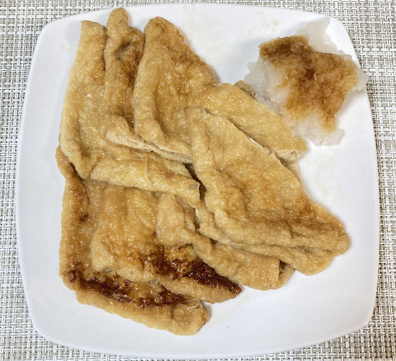 あげづけ材料(油揚げ2枚分)・油揚げ(薄揚げ) …… 2枚・しょう油、酒、みりん、水 …… 各大さじ1・白だし …… 小さじ1・好みで大根おろし、薬味ねぎ等 …… 適量作り方油揚げを半分に切り、ザルに入れて熱湯をかけ、油抜きする。キッチンペーパーを敷き①をのせ、その上からキッチンペーパーをかぶせて少し押して水分と油分を取る。鍋に酒とみりんを入れて火にかけ、沸騰させてアルコールを飛ばし、しょう油・水・白だしを入れ、温まったら火を止める。ビニール袋に油揚げと③を温かいうちに注ぎ入れ、油揚げがよく浸かるようにして空気を抜いて密封し、冷蔵庫で1時間以上(できれば一昼夜)寝かせる。④の味付き油揚げの水分を軽く絞って、フライパンかオーブントースターでで軽く焼き目をつける。皿に盛り、好みで大根おろしを添えるか、薬味ねぎを乗せて完成。 ツイートこのページの先頭へ戻る Top Menu