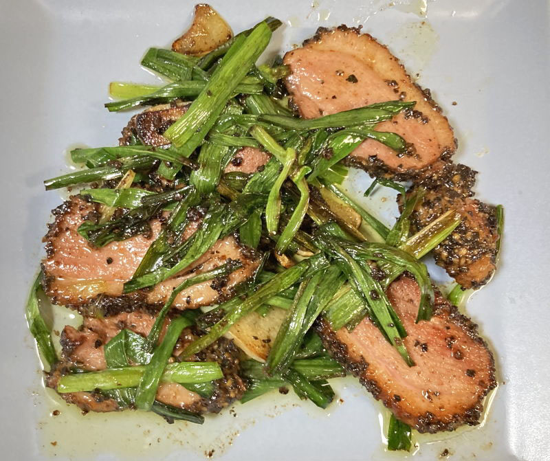 • 合鴨パストラミとニラのバター炒め